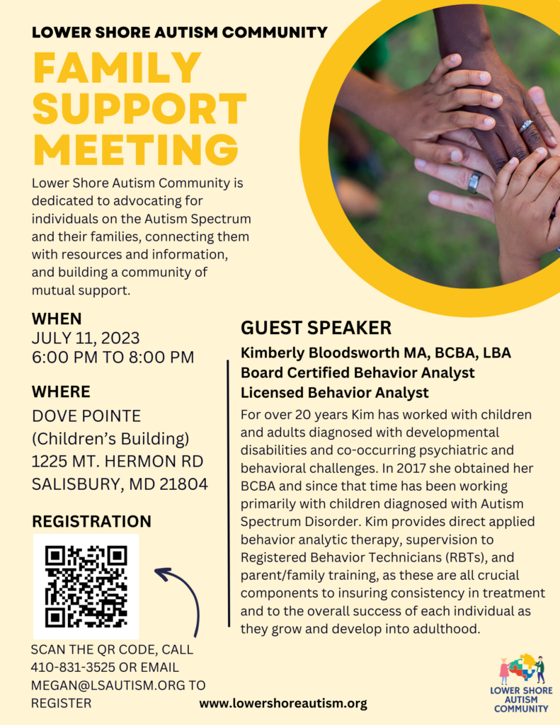 July Family Support Meeting – 7/11/23 by Megan Hardy / 3 years ago Join us Tuesday, July 11th for our monthly Family Support Meeting! This month we will have guest speaker Kimberly Bloodsworth joining us. Check out the flyer below for more information! To register, click HERE.