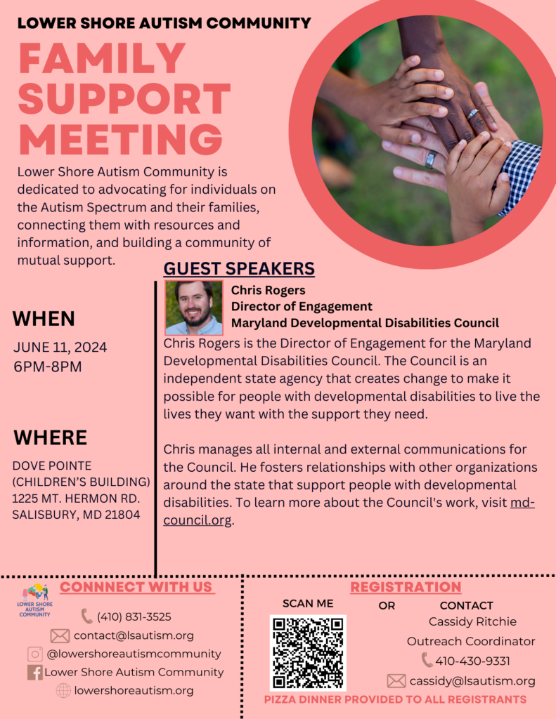 Click the link below to register for our June Family Support Meeting with Guest Speaker, Chris Rogers, Director of Engagement at Maryland Developmental Disabilities Council.